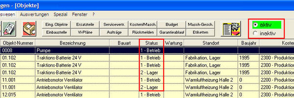 Die Zuteilung der Datensätze zu diesen zwei übergeordneten Zuständen erfolgt automatisch über die Vergabe des Status, z.B. bei Anlagen und Objekten in der Detailmaske im Register 'Allgemeines': Mit den Status "1 - Betrieb" oder "2 - Lager" wird ein Datensatz dem Bereich "aktiv" zugeteilt, die restlichen Status führen zu einer Zuteilung zu "inaktiv" (siehe Beispiel-Darstellungen oben und unten). Bei den Mitarbeitern dagegen gibt es drei "aktive" Status (Vollzeit, Teilzeit und Aushilfe) und zwei "inaktive" Status (Beurlaubt und Ausgetreten). Die Artikel, Adressen und Serviceverträge können ebenfalls in aktive und inaktive Datensätze eingeteilt werden - dort stehen ausschliesslich diese zwei Status zur Verfügung.