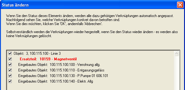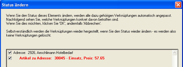 Wenn Sie den Status eines Elements ändern, werden alle dazu gehörigen Verknüpfungen automatisch angepasst. Im Dialog Status ändern werden alle Zuordnungen aufgelistet, die von dieser Anpassung betroffen sind, z.B. untergeordnete Objekte, Adressen oder Ersatzteile zu Objekten, Artikel zu Adressen, etc. Zuordnungen, die sich nur auf den aktuellen Datensatz beziehen, werden bei der Änderung von "aktiv" zu "inaktiv" in fetter roter Schrift dargestellt. Dies bedeutet, dass es möglicherweise sinnvoll ist, das entsprechende Element ebenfalls zu überprüfen und gegebenenfalls auch inaktiv zu setzen. Im ersten Beispielbild unten ist ein Ersatzteil nur dem Objekt, das inaktiv gesetzt werden soll, zugewiesen (so dass es wahrscheinlich anderweitig nicht gebraucht werden kann). Im zweiten Beispielbild hingegen ist ein Artikel nur der entsprechenden Adresse zugewiesen, so dass ohne Kontrolle und Überarbeitung der aufgeführte Artikel nach dem Inaktiv-Setzen der Adresse über keinen aktivierten Lieferanten mehr verfügt und beispielsweise nicht mehr bestellt werden kann.