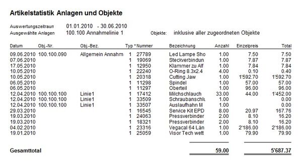 Auf dem Formular ist pro Zeile ersichtlich, auf welches untergeordnete Objekt die Artikel verbucht worden sind (sofern dies nicht direkt auf die Anlage geschehen ist). Die Sortierung ist aufsteigend nach Datum der Artikel-Rückmeldungen.