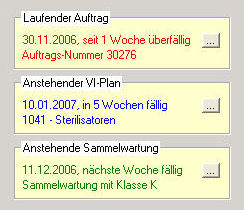 Anstehende elektr. Kontrolle / Anstehender Schmierplan / Anstehende Sammelwartung | Dieser dritte Bereich, der für anstehende Aktivitäten für das aktuelle Objekt reserviert ist, ist abhängig von Ihrer DYNAwin-Lizenz: Wenn Ihr Betrieb mit dem Modul "Medizintechnik" arbeitet, sehen Sie hier, ob eine elektrische Kontrolle ansteht; verfügt Ihre Firma über das Modul "Schmierplanung", wird hier angezeigt, ob ein Schmierplan vorhanden und fällig ist. Wenn Ihr Betrieb dagegen über keines dieser beiden Module verfügt, so wird hier angezeigt, ob eine Sammelwartung für dieses Objekt besteht. Anstehende elektr. Kontrolle: Sie sehen hier, ob für dieses Objekt eine elektrische Kontrolle besteht und wann diese fällig ist bzw. fällig war. Klicken Sie auf die Schaltfläche rechts, wenn Sie die Detailinformationen zu den elektrischen Kontrollen für dieses Objekt sehen möchten: Sie gelangen dann ins Register 'Medizintechnik' dieses Objekts. Anstehender Schmierplan: Dieses Feld zeigt Ihnen an, ob ein Schmierplan für dieses Objekt existiert und, wenn ja, wann dessen Auslösung fällig ist bzw. fällig war. Falls ein Schmierplan für das Objekt besteht, sehen Sie hier im Detail das Datum des nächsten Auslöse-Termins mit einer Zeitangabe (in Wochen), seit wann dieser Termin fällig ist, respektive wann er fällig sein wird; auf der zweiten Zeile erscheint die Schmierplan-Nummer sowie dessen Bezeichnung. Klicken Sie auf die Schaltfläche rechts, um in die Schmierplan-Verwaltung zu verzweigen und direkt den entsprechenden Schmierplan im Detail zu sehen. Anstehende Sammelwartung: Sie sehen hier, ob für dieses Objekt eine Sammelwartung besteht und wann diese fällig ist bzw. fällig war. Klicken Sie auf die Schaltfläche rechts, wenn Sie die Detailinformationen zur Sammelwartung für dieses Objekt sehen möchten: Sie gelangen dann ins Register 'Erweitert' dieses Objekts. In allen drei Fällen erscheinen die Angaben in roter Farbe, wenn der Auslöse-Termin bereits in der Vergangenheit liegt, in Grün, wenn der Termin innerhalb des nächsten Monats liegt und in Blau, sofern er weiter in der Zukunft liegt. |
