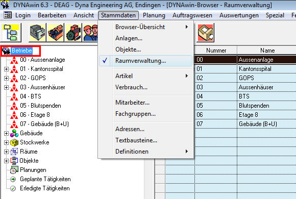 Die Raumverwaltungs-Betriebsebene können Sie über das Menü öffnen, oder Sie klicken direkt auf das Browser-Icon ganz links unter der Hauptmenü-Zeile. (In letzterem Fall müssen Sie je nach Ansicht mit der rechten Maustaste ins weisse Browser-Feld klicken und im sich öffnenden Kontextmenü auf umschalten). Markieren Sie nun links im Browser-Baum Betriebe, so dass rechts in der Tabelle alle Betriebs-Datensätze zur weiteren Bearbeitung aufgelistet werden.