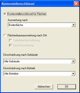 Im folgenden Dialog können Sie zwischen zwei Auswertungsarten wählen. Die erste - Kostenstellenschlüssel für Flächen - ermöglicht Ihnen, eine Auflistung der verschiedenen Kostenstellen nach einem bestimmten Flächentyp (z.B. Bodenfläche oder Rauminhalt Brutto) zu erhalten. Wählen Sie den gewünschten Flächentyp in der Auswahlbox Auswertung nach aus. In den zwei Auswahlboxen im unteren Teil der Maske können Sie im übrigen nach Gebäude und/oder nach Betrieb einschränken. Klicken Sie auf OK wenn Sie Ihre Selektion vorgenommen haben, um die Auswertung zu starten. Auf dem Auswertungsdokument werden anschliessend sämtliche Raumverwaltungs-Kostenstellen mit der jeweiligen Flächenangabe und dem prozentualen Anteil an der Gesamtfläche (aller Kostenstellen) aufgelistet.