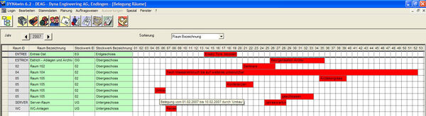 Es erscheint eine neue Tabelle, wo sämtliche Räume aufgelistet sind, bei denen im laufenden Jahr mindestens eine Belegung registriert ist. Von jedem aufgelisteten Raum sehen Sie die ID und den Bezeichnung, im Weiteren die Stockwerk ID und die Stockwerk Bezeichnung des Stockwerks, dem der jeweilige Raum zugeordnet ist. Alle Kolonnen rechts (01-53) stehen für die Wochen des Kalenderjahres. Anhand der rot markierten Wochenspalten bei den einzelnen Raum-Datensätzen können Sie auf einen Blick ersehen, wann welcher Raum belegt ist; zusätzlich erscheint im roten Balken die Angabe Belegt durch, die Ihnen angibt, wer gemäss Eingabe in diesem Register den Raum belegt (siehe weiter unten). Falls Sie die detaillierte Information zur Belegung erhalten möchten, fahren Sie mit Ihrer Maus auf die entsprechende rot markierte Belegung und es erscheint ein sogenannter "Tooltip", d.h. die Information von wann bis wann (exakte Daten) und durch wen der Raum belegt ist.