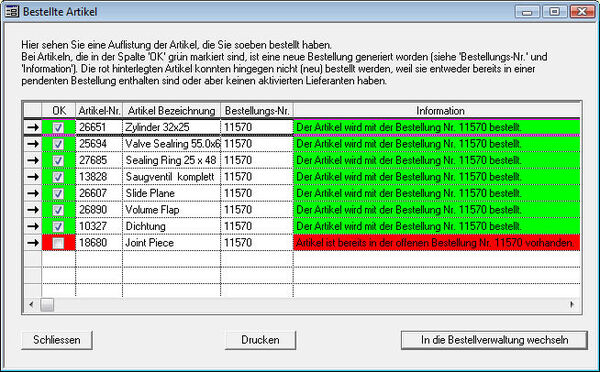 Sobald Sie hingegen mehrere Artikel bestellt haben, erscheint die Maske Bestellte Artikel. Diese gibt Aufschluss über die Zuteilung der bestellten Artikel zu den Bestellungs-Nummern: Pro Lieferant wird eine neue Bestellung generiert, sofern nicht bereits eine erfasste aber noch nicht gedruckte besteht. Vor allem aber gibt der Dialog Auskunft darüber ob die einzelnen Artikel überhaupt bestellt werden konnten. In der Spalte Information finden Sie bei Bedarf die Details pro Artikel (z.B. warum ein Artikel nicht bestellt werden konnte). Über die Schaltfläche Drucken lässt sich die Auflistung ausdrucken, ansonsten können Sie zur weiteren Bearbeitung In die Bestellverwaltung wechseln.