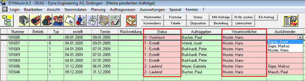 Diese Menüoption setzt voraus, dass Sie grundsätzlich mit dem Feld Verantwortlicher arbeiten und dort Ihren Namen im Format "Name, Vorname" eintragen - andernfalls wird immer die leere Auftragstabelle geöffnet. Um ein automatisiertes Arbeiten mit diesem Feld zu ermöglichen, sollte ausserdem in der Personalverwaltung Ihr Benutzername hinterlegt sein (siehe auch Register Allgemeines Mitarbeiter, Feld Benutzer). Kontaktieren Sie nötigenfalls den System-Betreuer von DYNAwin, da Sie in diesem Bereich selber keine Anpassung vornehmen können.