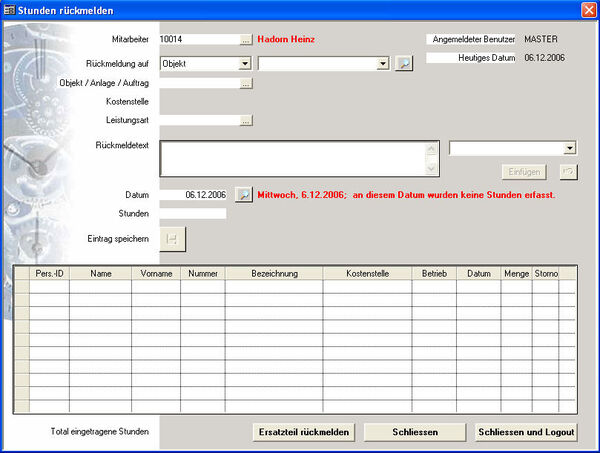 Über das Menü öffnen Sie die Maske für die einfache und schnelle Erfassung Ihrer Arbeitsstunden. Die Stunden können aber auch über die Rückmeldung verbucht werden.