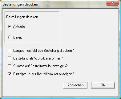 Bestellungen drucken | Wenn Sie Aktuelle wählen, so wird nur die momentan markierte Bestellung gedruckt. Wählen Sie hingegen Bereich, so können Sie rechts in den Feldern Ab und Bis mittels der Bestell-Nummern einen Bereich von Bestellungen drucken. Jede Bestellung erscheint dabei auf einem separaten Formular. |