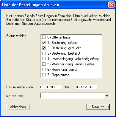 Bestimmen Sie im folgenden Dialog, durch Anklicken der jeweiligen Kontrollkästchen im Bereich Status wählen, welche Stati in die Liste miteinbezogen werden sollen. Definieren Sie anschliessend die Periode der Bestellungen in den Feldern Datum wählen von und bis (Format TT.MM.JJJJ).