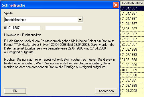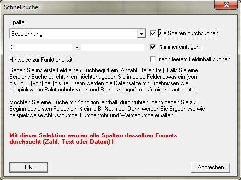 Hinweis: Das zweite Feld im Schnellsuche-Dialog stellt wie gesagt nur eine zusätzliche Option dar. Sie können immer auch eine Eingabe nur im ersten Feld vornehmen (mit Ausnahme der Datumsspalten, wo bei Suche nach einem bestimmten Datum die Eingabe "von-bis" des gleichen, spezifischen Datums nötig ist).