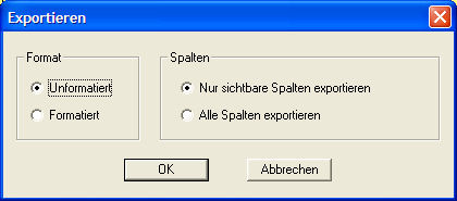 Wenn Sie das Menü [Bearbeiten] [Exportieren...] wählen, wird ein Dialog geöffnet, in welchem Sie das Format und die zu exportierenden Spalten der Tabelle definieren müssen.