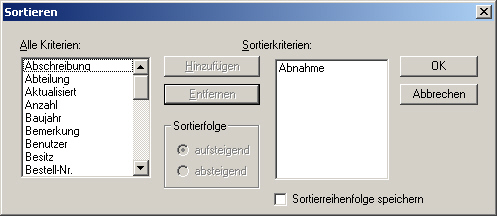 Das Menü [Bearbeiten] [Sortieren...] erlaubt Ihnen, eine Sortierung innerhalb der aktuellen Tabelle einzugeben, die als Sortierkriterium mehr als nur eine Spalte beinhaltet. Mit der Schnellsuche haben Sie ja die Möglichkeit, eine Spalte zu bestimmen, nach der sortiert werden soll, jedoch nur nach dieser einen und zudem nur in aufsteigender Form. Wenn Sie also beispielsweise die Tabelle Ersatzteile nach Bezeichnung aufsteigend und bei gleicher Bezeichnung jeweils nach Preis absteigend sortieren möchten, nutzen Sie diese erweiterte Sortierfunktion.