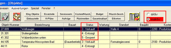 Die Zuteilung der Datensätze zu diesen zwei übergeordneten Zuständen erfolgt automatisch über die Vergabe des Status, z.B. bei Anlagen und Objekten in der Detailmaske im Register 'Allgemeines': Mit den Status "1 - Betrieb" oder "2 - Lager" wird ein Datensatz dem Bereich "aktiv" zugeteilt, die restlichen Status führen zu einer Zuteilung zu "inaktiv" (siehe Beispiel-Darstellungen oben und unten). Bei den Mitarbeitern dagegen gibt es drei "aktive" Status (Vollzeit, Teilzeit und Aushilfe) und zwei "inaktive" Status (Beurlaubt und Ausgetreten). Die Artikel, Adressen und Serviceverträge können ebenfalls in aktive und inaktive Datensätze eingeteilt werden - dort stehen ausschliesslich diese zwei Status zur Verfügung.