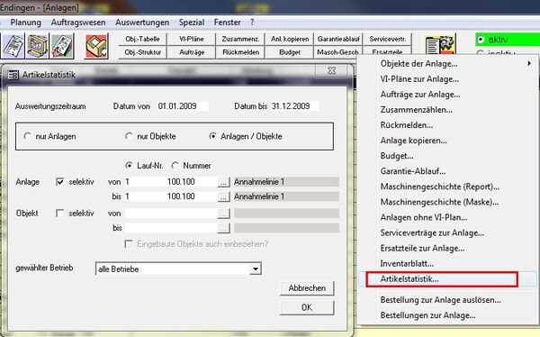 Markieren Sie die Anlage, von welcher Sie eine Artikelstatistik erstellen möchten. Wählen Sie dann im Optionsmenü [Artikelstatistik...]. Der zugehörige Diaolog wird geöffnet und als Anlage automatisch jene vorgeschlagen, welche Sie in der Tabelle ausgewählt hatten.