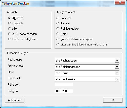 Alle | Damit werden alle Tätigkeiten gedruckt, unabhängig vom Status. |