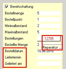 Geliefert am | Datum, wann die Lieferung des oder der bestellten Artikeln eingetroffen ist (Wareneingang). Hinweis: Ist nur ein Bestelldatum (oben) eingetragen und in diesem Feld nichts, dann ist die Bestellung offen und noch kein Wareneingang registriert worden. Ist in beiden Feldern ein Datum eingetragen, handelt es sich um einen Teil-Wareneingang (es ist noch nicht die gesamte bestellte Menge des Artikels eingegangen). Steht hingegen nur hier ein Datum und im Feld Bestelldatum nichts, dann ist die letzte Bestellung komplett eingegangen. Das Datum verschwindet wieder, sobald eine neue Bestellung mit dem betreffenden Artikel ausgelöst wird. |