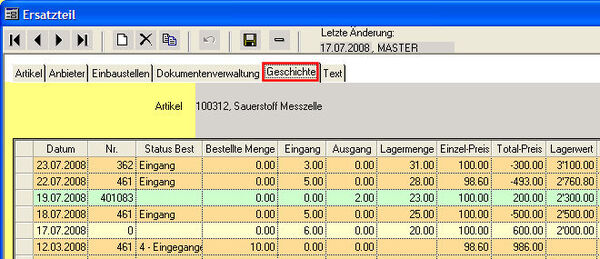 In diesem Register erhalten Sie sämtliche Informationen über Veränderungen dieses Artikels, was seine Lagermenge und den Lagerwert angehen. Es werden sowohl die Eingänge als auch die Ausgänge auf alle erdenkliche Arten berücksichtigt: Ausserdem ist ersichtlich, ob diese Bewegungen durch den Zusammenhang mit der Bestellverwaltung oder des Auftragswesens (Rückmeldungen) oder aber durch manuelle Änderung zustande gekommen sind (beachten Sie dazu auch die Farblegende unten in der Maske).
