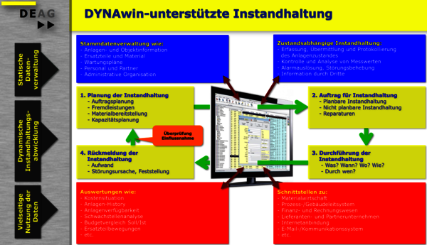 DYNAwin ist ein leistungsfähiges, in der Praxis erprobtes Softwarepaket für die Instandhaltung, das alle wesentlichen Funktionen beinhaltet, die für einen optimalen Instandhaltungsbetrieb in unterschiedlichen Branchen und Einsatzgebieten notwendig sind und folgende Kundenbedürfnisse befriedigen können: