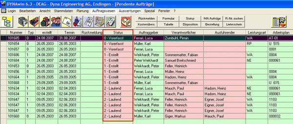 Wenn Sie das Menü wählen, erhalten Sie alle Aufträge aufgelistet, die einen Status zwischen "0" und "2" aufweisen (d.h. "0 - Vorerfasst", "1 - Erstellt" oder "2 - Laufend").