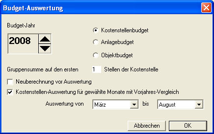 Wählen Sie danach rechts den gewünschten Budget-Typ, d.h. welche Art von Budgets die Auswertung berücksichtigen soll: Kostenstellenbudget, Anlagebudget oder Objektbudget.