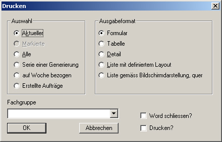 Die Option Word schliessen? bedeutet, dass nach Erstellung und Druck der Aufträge das Programm Microsoft Word mit den Aufträgen geschlossen wird. Wenn Sie Drucken? anwählen, wird der Auftrag automatisch ohne weitere Fragedialoge gedruckt.
