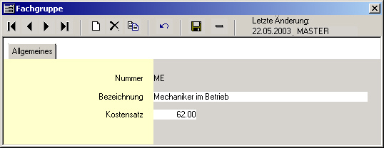 Wie im untenstehenden Beispiel der Detailmaske 'Fachgruppe' ersichtlich, ist die Masken-Grundfarbgebung (gelb) mit jener der Stammdaten-Tabellen identisch. Im oberen Bereich der Detailmaske finden Sie jeweils eine sogenannte Toolbar, welche folgende Icons und Funktionen beinhaltet: