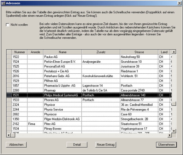 Nicht scrollen | Bei sehr vielen Datensätzen kann es eine gewisse Zeit dauern, bis der von Ihnen gewünschte Eintrag gefunden und mit Scrollen ausgewählt wurde. Durch Anklicken des Auswahl-Kästchens können Sie die Wartezeit deutlich verkürzen, indem die Tabelle (bei erneutem Öffnen) nur ab dem vorgängig eingegebenen Datensatz gefüllt wird. Zum Darstellen aller Einträge - also auch der vor dem ausgewählten liegenden - können Sie die Schnellsuche in bekannter Art und Weise verwenden. |