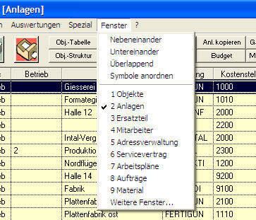 Das Menü erscheint, sobald eine Tabelle offen ist. Mit den Menüoptionen , und können Sie die offenen Fenster in DYNAwin anordnen. Die Darstellung hängt dabei von der Anzahl offener Fenster ab. Die Menüoption hat eine Bedeutung, wenn Sie mehrere Fenster offen haben und diese jeweils durch einen Mausklick rechts oben in der Tabelle minimieren: In diesem Fall werden die verkleinerten Tabellenleisten unten auf dem Bildschirm sauber angeordnet.