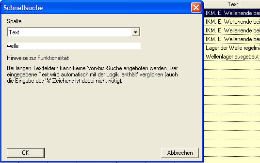 Bei langen Textfeldern (also jenen Tabellenspalten, wo der Inhalt eines Text-Registers angezeigt wird) erscheint auch weiterhin nur ein Feld in der Schnellsuche. Hier müssen Sie kein "%"-Zeichen verwenden, denn die Suche erfolgt auf jeden Fall mit der Logik 'enthält' - also irgendwo im Text.
