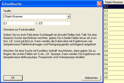 Das zweite Feld steht für eine Bereichs-Schnellsuche zur Verfügung, so dass Sie einen "von-bis" Bereich einschränken können. Geben Sie dazu ins erste Feld die "von" Kondition ein und ins zweite die "bis" Kondition. Beispielsweise kann die Eingabe von "Klam" bis "Klin" folgende Resultate ergeben: "Klammer", "Klebband", "Klemmdichtung", "Klemme", "Klingenträger". Die Anzahl Zeichen bei der Eingabe muss nicht in beiden Feldern gleich sein. Sobald Sie aber im ersten Feld ein "%" eingeben, so wird das zweite Feld gesperrt: Bei einer Schnellsuche mit Kondition 'enthält' - zu welcher dieses Zeichen dient - reicht ein einziges Feld, bzw. es ist keine Bereichs-Schnellsuche im beschriebenen Sinne denkbar.