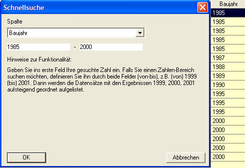 Hinweis: Das zweite Feld im Schnellsuche-Dialog stellt wie gesagt nur eine zusätzliche Option dar. Sie können immer auch eine Eingabe nur im ersten Feld vornehmen (mit Ausnahme der Datumsspalten, wo bei Suche nach einem bestimmten Datum die Eingabe "von-bis" des gleichen, spezifischen Datums nötig ist).