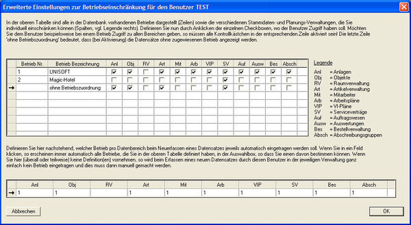 Erweiterte Einstellmöglich- keiten | Möchten Sie einem Benutzer Zugang zu mehr als einem Betrieb (aber nicht zu allen) geben? Dann wählen Sie in der Hauptmaske - sofern der Exklusiv-Modus aktiviert ist - den entsprechenden Benutzer in der Auswahlbox aus, und selektionieren unten die Möglichkeit mehrere Betriebe. Beim ersten Mal wird dann automatisch die folgende Definitionsmaske für die Einstellungen geöffnet (siehe Beispielbild oben). Ansonsten - wenn Sie beispielsweise die Einstellungen ändern möchten - klicken Sie auf die Schaltfläche . Die folgende Maske dient ausschliesslich zur Definition der einzelnen Betriebe, zu denen der ausgewählte Benutzer pro DYNAwin-Bereich Zugang haben darf, das heisst es sind detaillierte Einstellungen der Ansicht für den betreffenden Benutzer möglich. Diese Einstellungen sind von den Zugriffsrechten, die der System-Administrator ebenfalls definieren muss, unabhängig. Es wird hier also nicht definiert, ob der Benutzer im jeweiligen Bereich nur Lese-, Schreib- oder auch Löschrecht hat! Die wichtigsten Erklärungen zum Vorgehen betreffend den möglichen Einstellungen sind in der Maske selber enthalten - wir empfehlen Ihnen, sie aufmerksam durchzulesen. Die obere Tabelle (Matrix) enthält sämtliche Betriebe aufgelistet, die in Ihrer Datenbank enthalten sind. Zusätzlich gibt es am Schluss eine Zeile ohne Betriebszuordnung, die alle Datensätze umfasst, bei denen kein Betrieb zugewiesen ist. Als Spalten sind fix alle DYNAwin Bereiche aufgeführt, bei denen Sie einzeln definieren können, ob der Benutzer Zugang haben soll oder nicht. Es sind dies die Bereiche Anlagen, Objekte, Raumverwaltung, Artikel, Mitarbeiter, Arbeitspläne, VI-Pläne, Serviceverträge, Auftragswesen, Auswertungen, Bestellwesen und Abschreibungsgruppen. Beachten Sie die Legende rechts in der Maske, zumal die Spaltentitel abgekürzt sind! Die Definition des Zugriffs erfolgt durch Anklicken der einzelnen Kontrollkästchen: Ist die jeweilige Checkbox im Schnittpunkt zwischen dem Betrieb (Zeile) und dem gewünschten DYNAwin-Bereich (Spalte) angeklickt, so hat der entsprechende Benutzer Zugang zu diesen Daten. Gemäss dem Beispielbild oben, hat der Benutzer "TEST" unter anderem bei den Anlagen, Objekten und Artikeln Zugang zu den Daten des Betriebes UNISOFT sowie zu jenen ohne Betriebszuweisung, bei den Serviceverträgen zu sämtlichen Daten, bei den Arbeits- und VI-Plänen sowie den Aufträgen hingegen nur zu den Daten von UNISOFT. Die untere Tabelle ermöglicht Ihnen, zusätzlich zu bestimmen, dass der entsprechende Benutzer beim Neuerfassen von Daten jeweils (im neu eröffneten Datensatz des jeweiligen DYNAwin-Bereiches) direkt einen bestimmten Betrieb zugewiesen bekommen soll. Klicken Sie dazu ins entsprechende Feld und es erscheint eine Auswahlliste, die sämtliche in der oberen Tabelle aktivierten Betriebe enthält: Wählen Sie den gewünschten Betrieb aus. Wenn Sie eines oder mehrere Felder leer lassen, dann bedeutet dies ganz einfach, dass kein Betrieb automatisch zugewiesen wird und der Benutzer dies manuell machen muss. Wenn Sie alle Einstellungen vorgenommen haben, klicken Sie auf um diese abzuspeichern. Zusätzliche Hinweise: Wenn der Benutzer in einer Detailmaske die Referenztabelle 'Betriebe' öffnet, so sieht er immer exakt jene Betriebe, die er im entsprechenden Datenbereich sehen und somit auch zuweisen darf. Darf er nur die Datensätze 'ohne Betriebszuordnung' sehen, so ist die Referenztabelle leer. Öffnet der Benutzer hingegen die Betriebsverwaltung via Menü , dann sieht er alle Betriebe, die er maximal sehen darf (sozusagen die Summe aus allen Bereichs-Definitionen). Sofern er das Recht besitzt, neue Betriebe anzulegen, wird er den neu von ihm angelegten Betrieb allerdings nicht sehen. Ein neuer Betrieb erscheint nämlich bei jedem Benutzer mit der Einstellung mehrere Betriebe als Zeile, in der keine Checkbox angeklickt und der Benutzer somit keinen Zugang hat. Kontaktieren Sie deshalb nötigenfalls Ihren System-Administrator, falls dieser Fall auf Sie zutrifft! |
