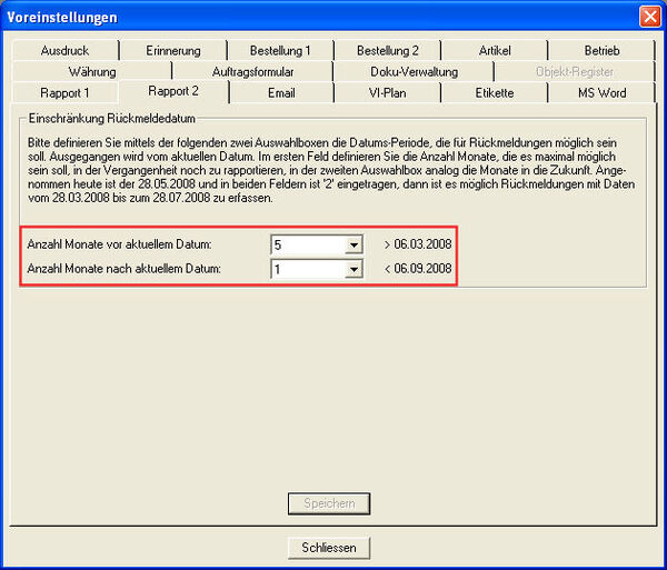 Einschränkung Rückmeldedatum | Um die Wahrscheinlichkeit falscher Rückmeldedaten gering zu halten, wird die mögliche Rückmeldeperiode insofern eingeschränkt, als dass ausserhalb der zulässigen Periode eine Meldung erscheint und das Datum bestätigt werden muss. Es ist also nach wie vor möglich, für jedes beliebige Datum eine Rückmeldung zu machen - allerdings bedarf dies bei 'ungewöhnlichen' Daten neu einer Bestätigung. Bestimmen Sie die Periode möglicher Rückmeldedaten anhand der zwei Auswahlboxen Anzahl Monate vor aktuellem Datum und Anzahl Monate nach aktuellem Datum. Es stehen je 0-12 Monate zur Verfügung, das heisst es ist möglich, nur den heutigen Tag (ohne notwendige Bestätigung) freizugeben, oder aber Sie können maximal ein Jahr retour und ein Jahr vorwärts das Rückmelden uneingeschränkt zulassen. Rechts der Auswahlbox sehen Sie jeweils ab bzw. bis wann die definierte Rückmeldeperiode geht. Standardmässig wird übrigens eine Periode von plus/minus zwei Monaten uneingeschränkt zugelassen. Hinweis: Falls Sie die Rapportierungsmöglichkeiten imperativ einschränken möchten, so konsultieren Sie im vorangehenden Register Rapport 1 den Bereich Rapporteingaben. Letztere Funktion hat übrigens immer Vorrang gegenüber der hier beschriebenen! |