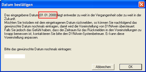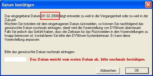 Überschreitet das vom Benutzer eingegebene Rückmelde-Datum die gesetzten 'Leitplanken' in die eine oder andere Richtung, dann erscheint die im Bild oben ersichtliche Meldung und das Datum muss nochmals eingegeben werden. Wird dann ein anderes Datum als das zuerst definierte eingegeben, dann erscheint nochmals dieselbe Meldung mit dem roten Hinweis (vgl. Bild unten). Bitte bestätigen Sie in diesem Fall das Datum nochmals.