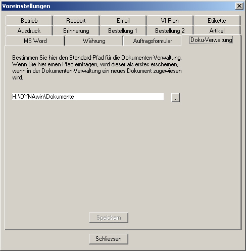 Damit haben Sie als System-Administrator die Möglichkeit, einen Pfad vorzudefinieren, wohin die Dokumentenverwaltung aus den verschiedensten Bereichen zuerst zeigen soll. Dies kann z.B. ein Verzeichnis "DYNAwin Dokumente" auf dem Server sein, in welchem verschiedene Unterverzeichnisse für Pläne, Handbücher, Korrespondenz, Fotos etc. vorhanden sind und dann angewählt werden können. Es lässt sich damit zwar nicht einschränken, dass nur Dokumente aus diesem Pfad in die Dokumentenverwaltung als Link eingefügt werden, aber die Zuordnung ist deutlich schneller vollzogen, die Ablageordnung besser und allfällige Server-Wechsel sind einfacher durchführbar.